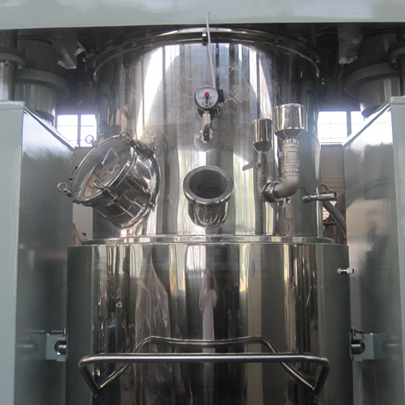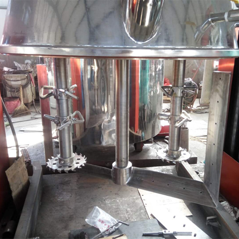 強(qiáng)力分散機(jī)有三個(gè)電動(dòng)機(jī),釜內(nèi)有三根不同形式的攪拌器,其中一個(gè)攪拌器在繞釜體軸線轉(zhuǎn)動(dòng),其余兩個(gè)攪拌裝置又以不同的轉(zhuǎn)速,繞自身軸線高速自轉(zhuǎn),使物料在釜內(nèi)作復(fù)雜的運(yùn)動(dòng),受到強(qiáng)烈的剪切和搓合。機(jī)器設(shè)備內(nèi)山形刮刀繞釜體軸線轉(zhuǎn)動(dòng),將粘在壁上和底部的原料刮出,使其效果更為理想。設(shè)備密封性好,可抽真空,具有良好的排氣除泡效果。設(shè)備缸蓋可液壓升降,缸體可自由移動(dòng),操作十分方便。攪拌器的形式,根據(jù)物料要求可為多層槳葉式、框式、蝴蝶式、葉輪式等。通常采用變頻調(diào)速,以滿足各種工藝要求。
