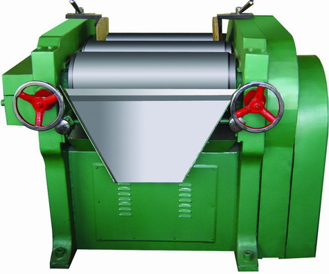 三輥研磨機(jī)是通過水平方向排列的三根輥筒不等速旋轉(zhuǎn)相互擠壓,使得相鄰軋輥產(chǎn)生強(qiáng)烈剪切力,從而磨擦、剪切,完成對漿料的研磨。