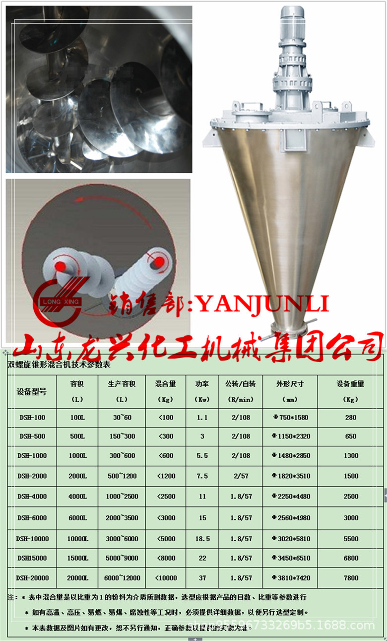 雙螺旋錐形混合機(jī)的料筒倒錐形,內(nèi)設(shè)有兩個(gè)非對(duì)稱的提升螺旋,在物料混合時(shí)兩只螺旋自轉(zhuǎn)對(duì)物料產(chǎn)生提升力,物料隨螺旋運(yùn)動(dòng)到料筒上部向中心凹陷處匯合下落,填充混料機(jī)底部的物料空缺,之后再受到螺旋的提升形成往復(fù)過程。轉(zhuǎn)臂會(huì)延筒壁呈慢速轉(zhuǎn)動(dòng)狀態(tài),推動(dòng)未進(jìn)入螺旋的物料,在不同高度上進(jìn)入螺柱,使料筒內(nèi)的物料能全方位的得到混合和攪拌,加快了物料的更新和擴(kuò)散速度。