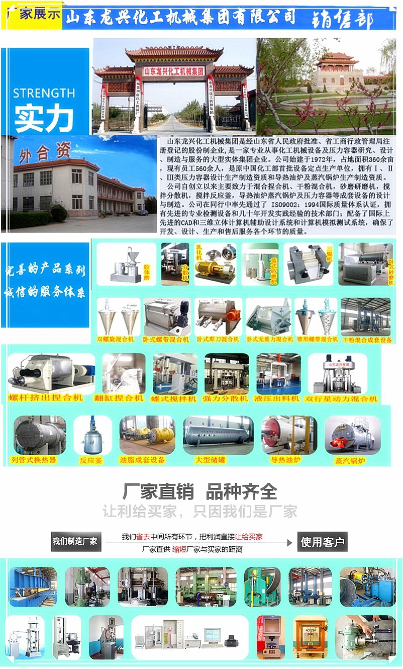山東龍興化工機(jī)械集團(tuán)憑借在業(yè)內(nèi)三十多年的技術(shù)積累和成長(zhǎng)經(jīng)歷,已經(jīng)發(fā)展為集科研、開發(fā)、制造為一體的科技型集團(tuán)公司,主要業(yè)務(wù)涉及液體研磨機(jī)、攪拌分散機(jī),膏體混拌捏合機(jī)、雙行星動(dòng)力攪拌混合機(jī),干粉攪拌混合機(jī),導(dǎo)熱油、蒸汽鍋爐、低溫容器及反應(yīng)釜罐和換熱器及一二三類壓力容器的設(shè)計(jì)與生產(chǎn)。同時(shí)我們承接行業(yè)用戶成套設(shè)備及生產(chǎn)線的設(shè)計(jì)制造業(yè)務(wù),龍興人愿與天下有識(shí)之士攜手共創(chuàng)新的輝煌。